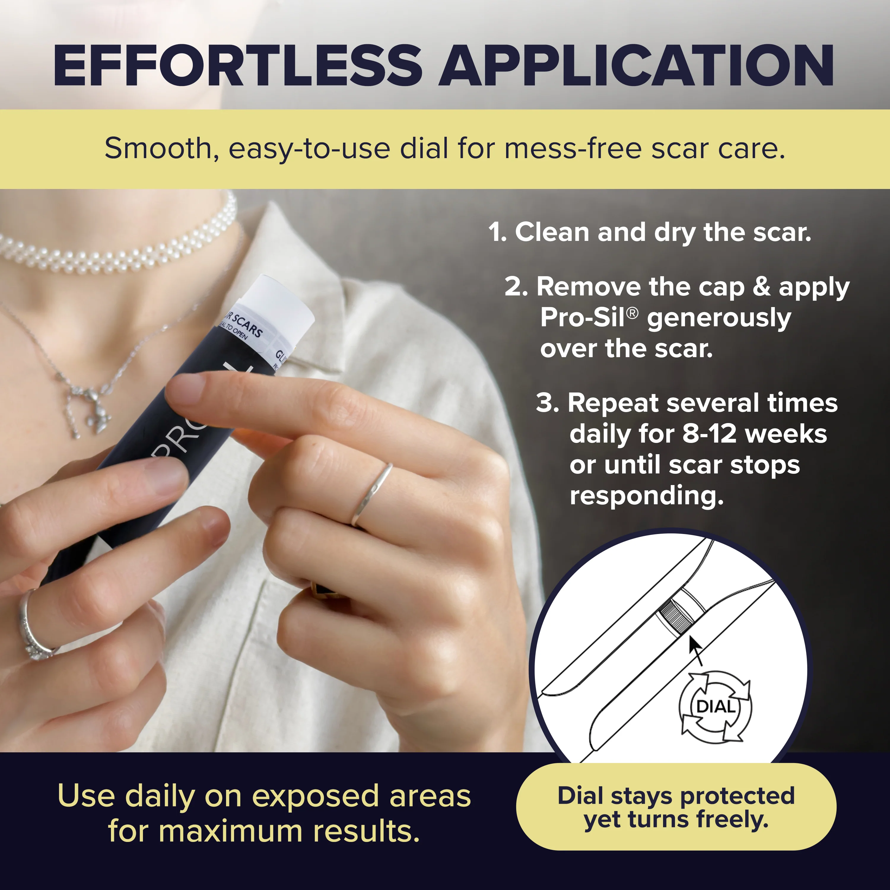 Pro-Sil Elite Carry, On-the-Go Application: Designed for convenience, our compact silicone scar gel stick fits seamlessly into pockets, purses, and gym bags. The twist-and-protect case keeps your silicone gel stick clean and ready for use anytime, anywhere.